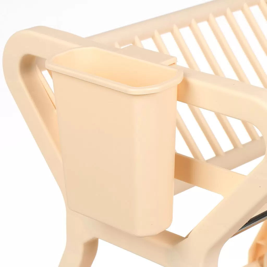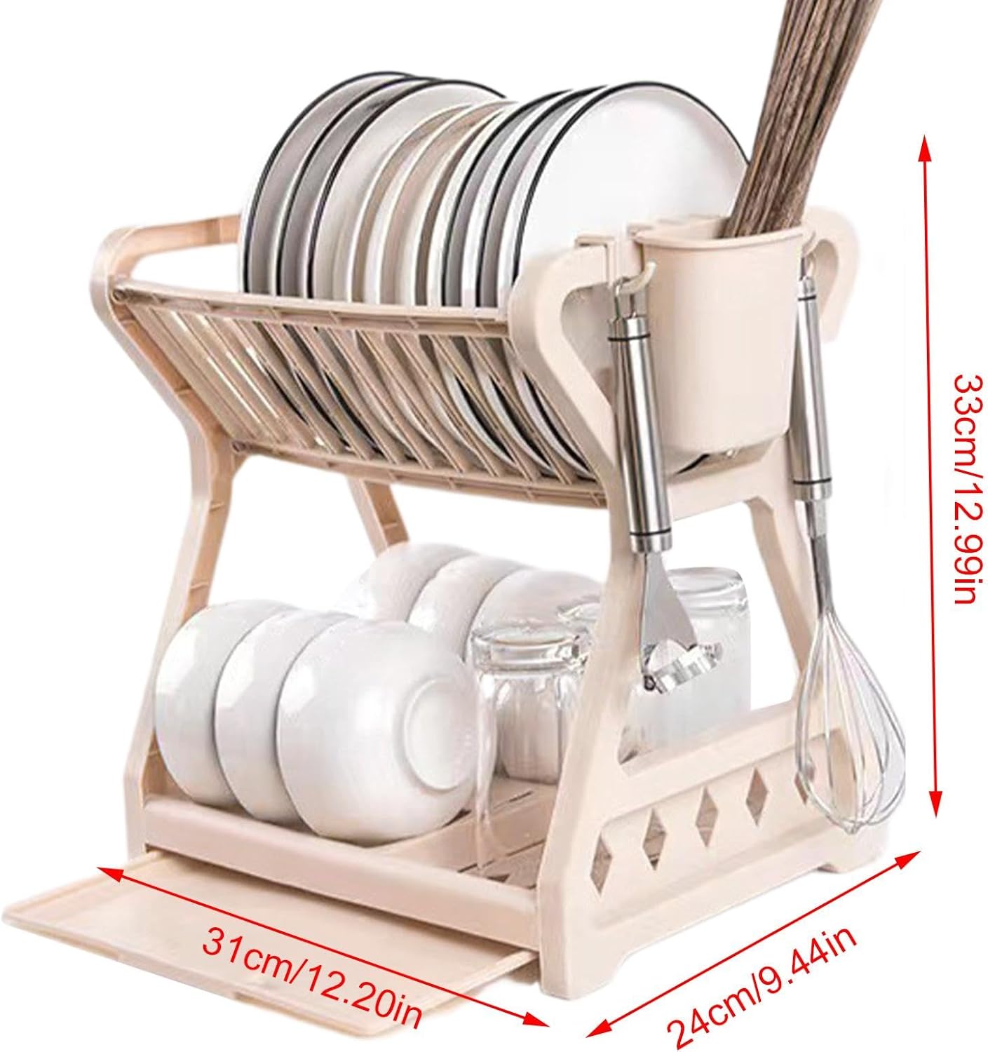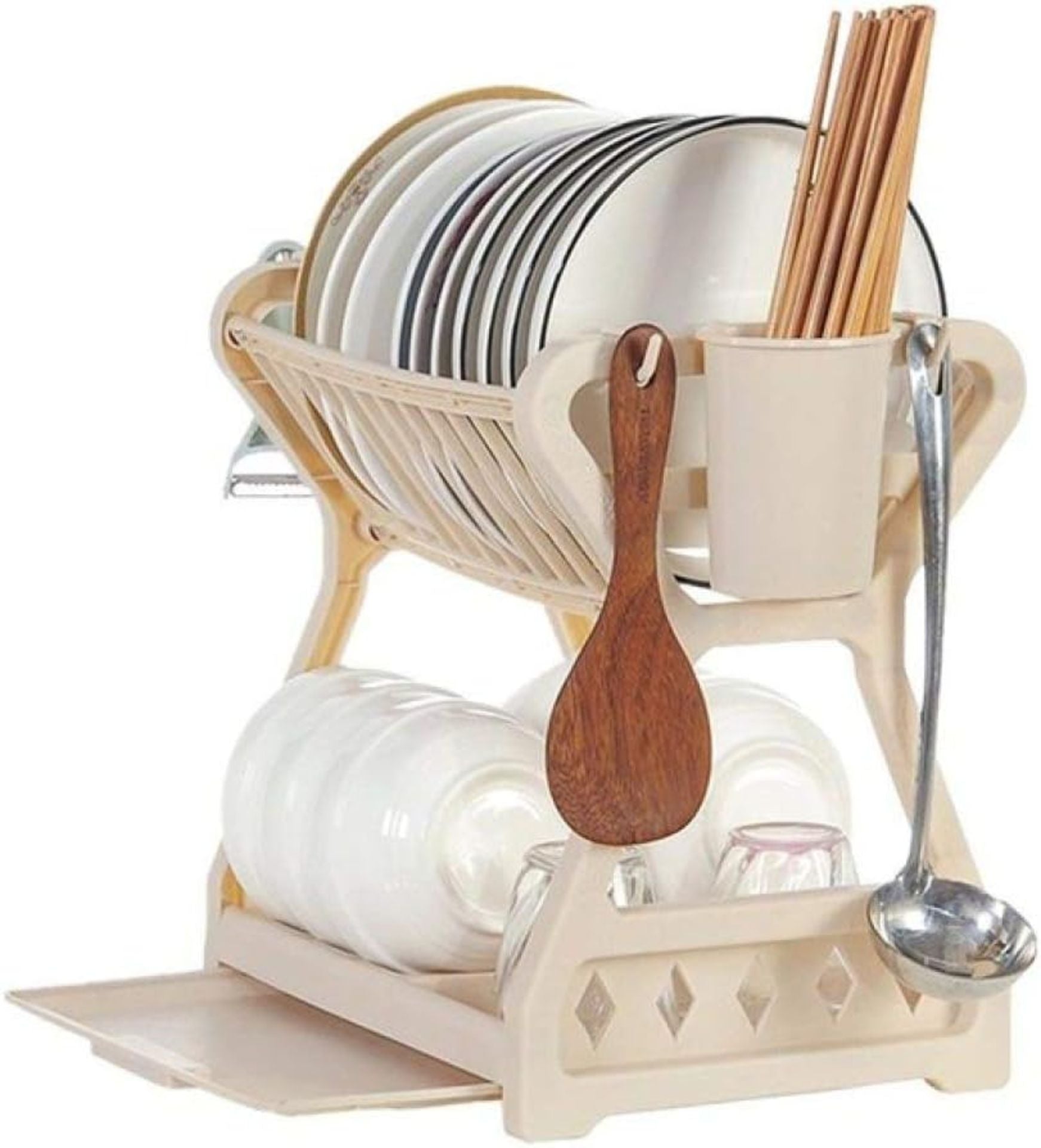 2-Tier Multifunctional Plastic Dish Drain Rack with Removable Drip – Beige