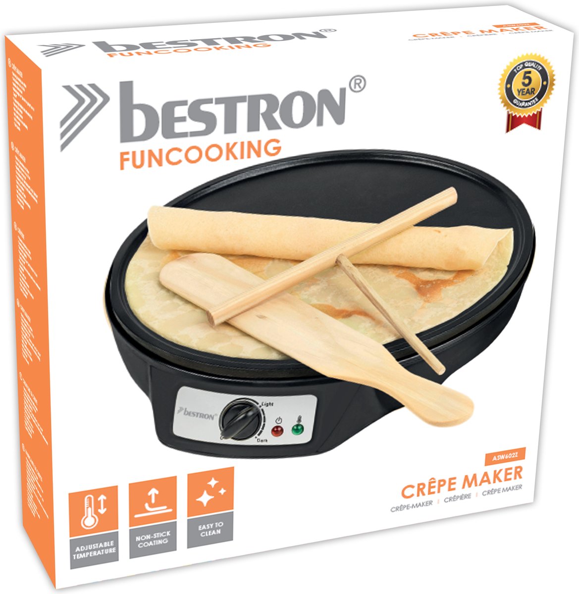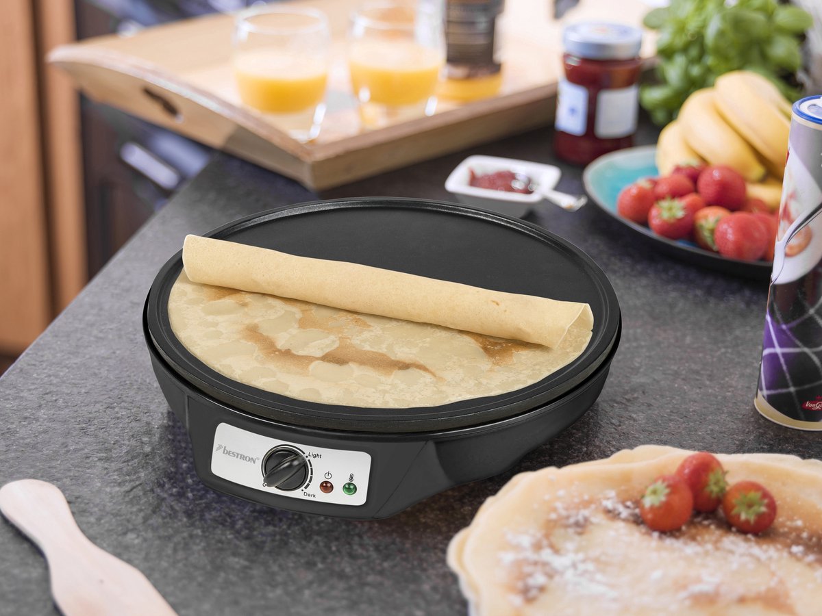 Bestron Crepe Maker – 30cm Non-Stick Pancake & Omelette Plate with Spatula & Batter Spreader, 1000W, Indicator Light – Black