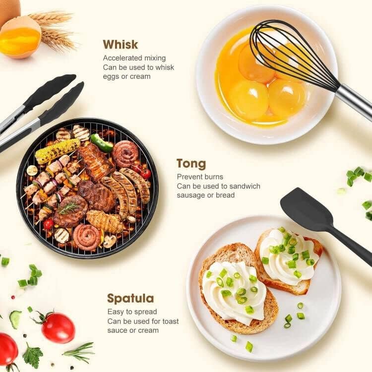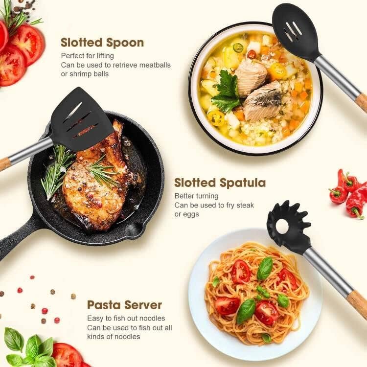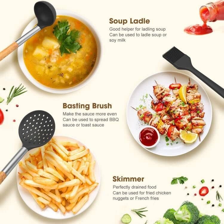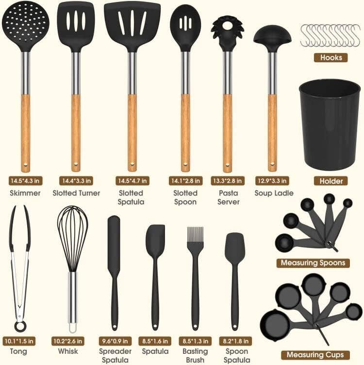 LVEON 33-Piece Silicone Kitchen Utensils Set – Wooden Handles – Black