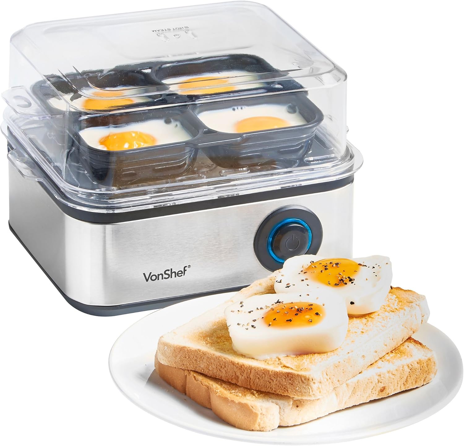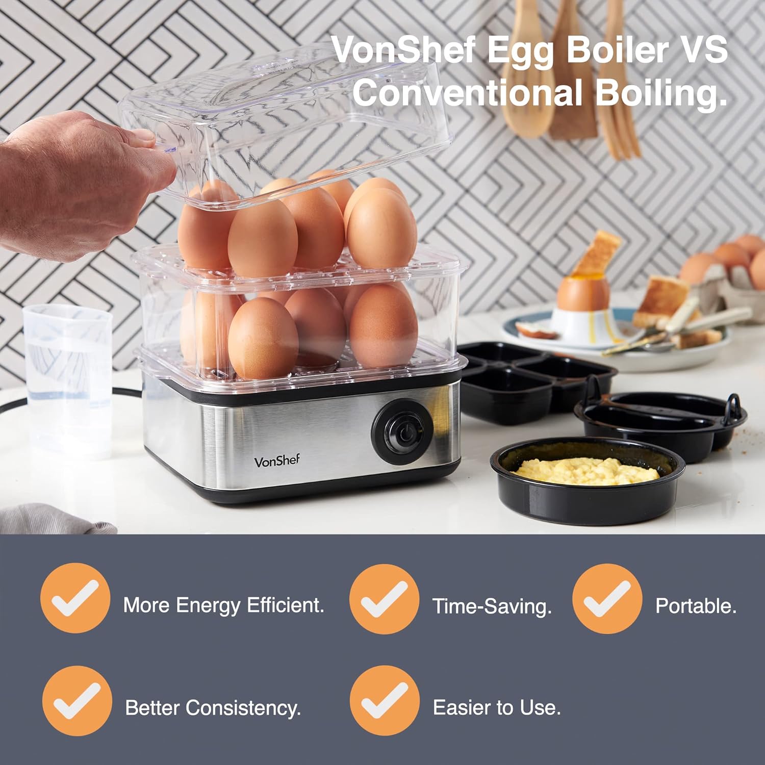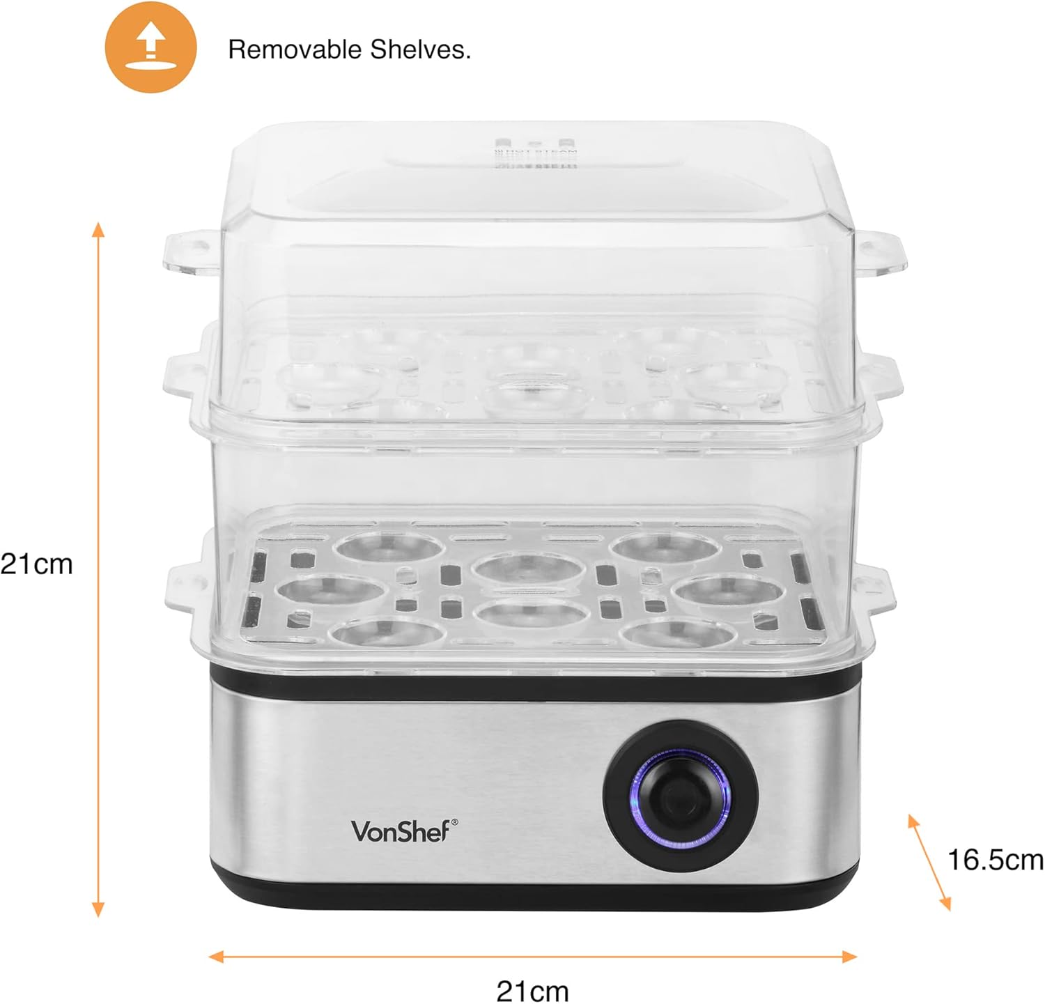 VonShef 3-in-1 Egg Boiler, Poacher & Omelette Maker – 16 Egg Capacity, Stainless Steel 500W Electric Cooker with Auto Shut-Off