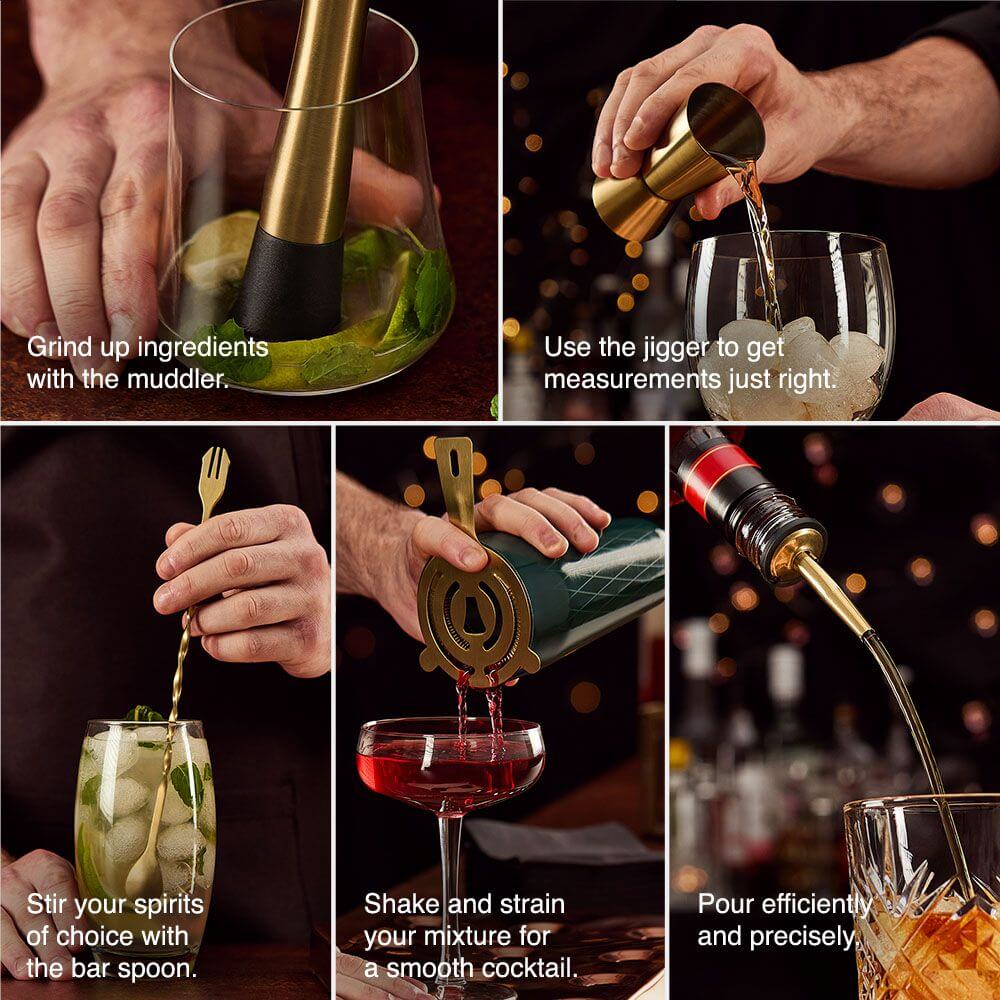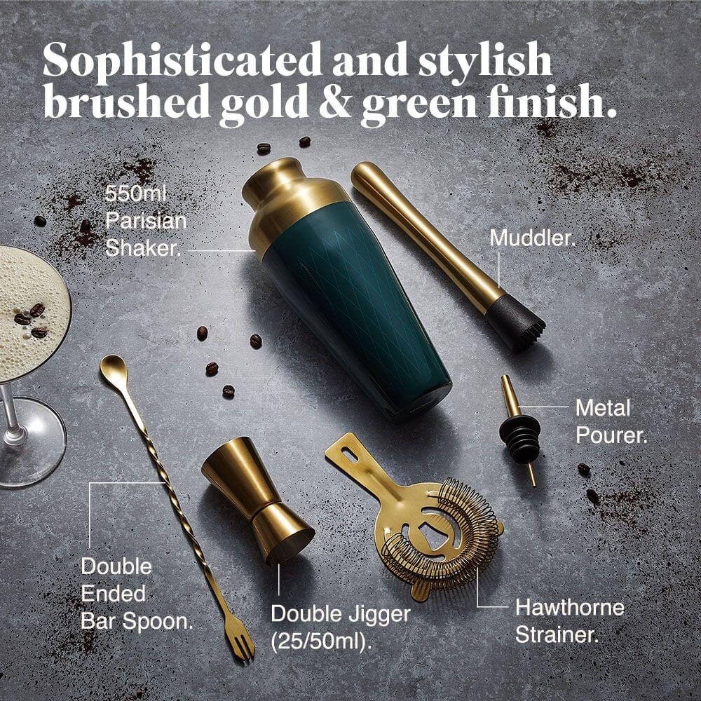 VonShef Parisian Green & Gold Cocktail Shaker Set – 6 Piece Bartender Kit