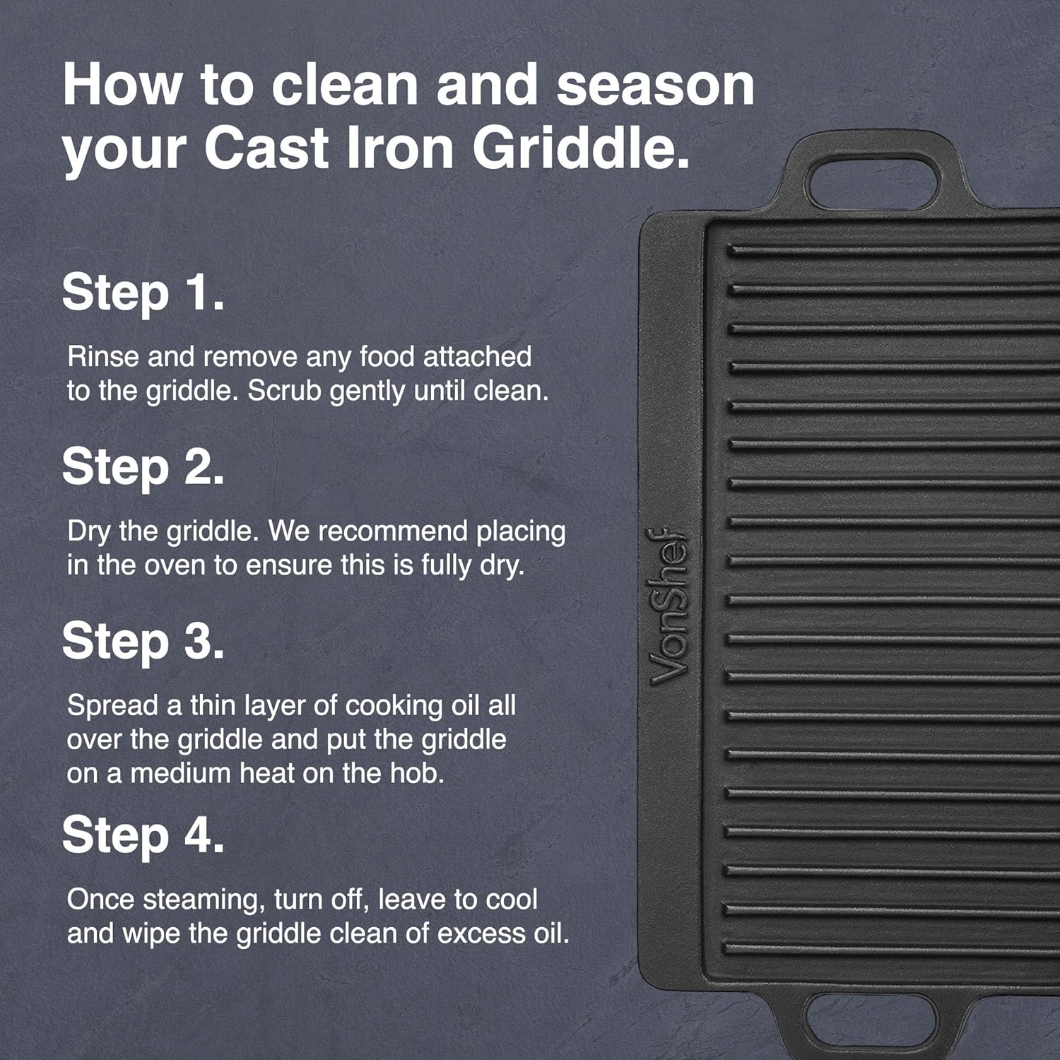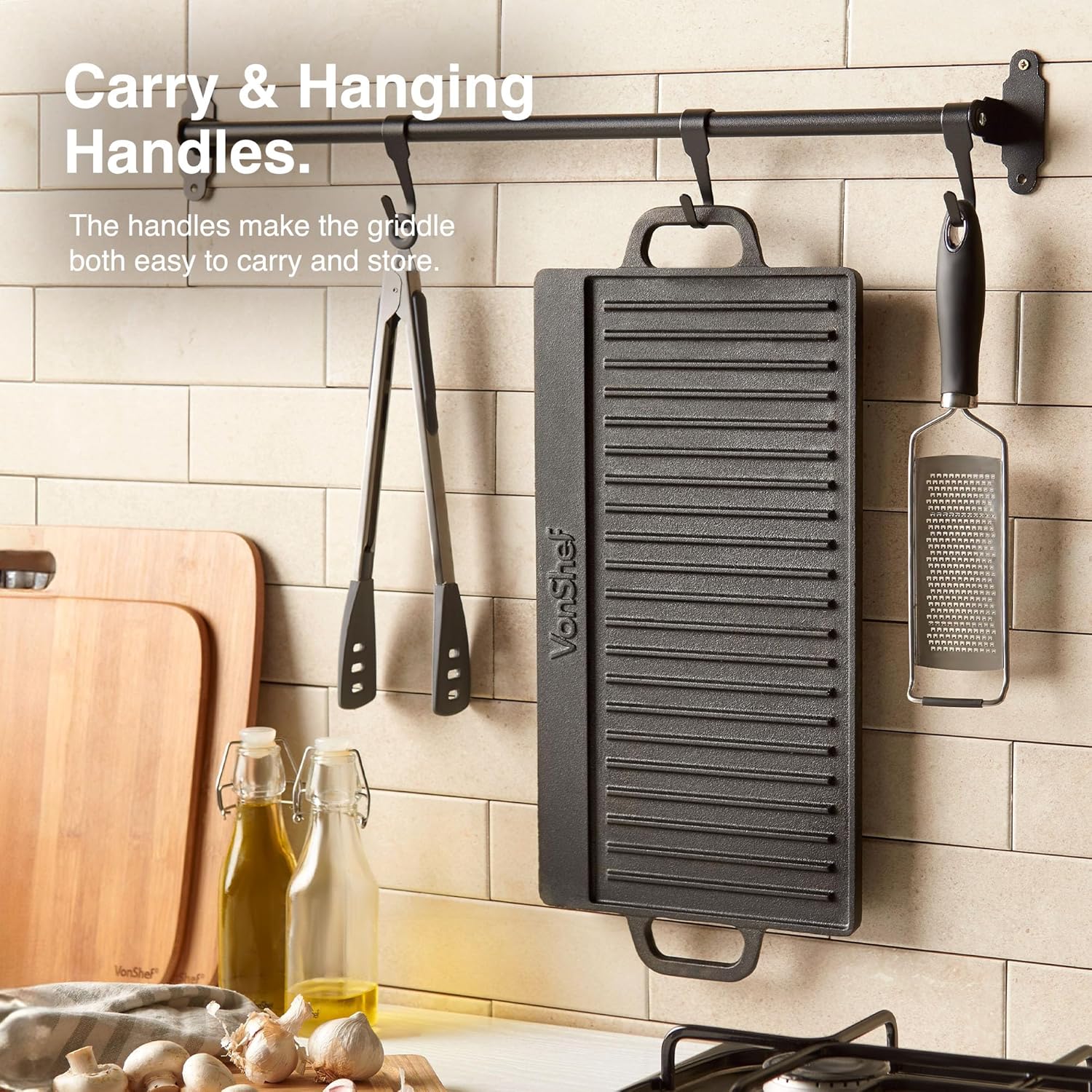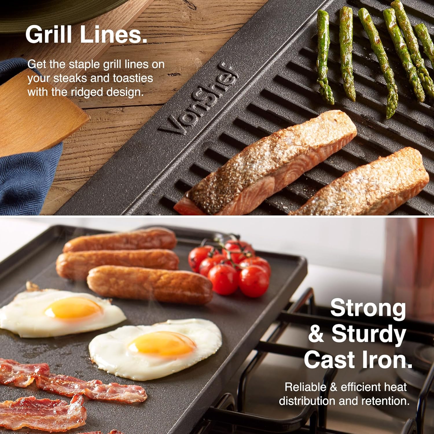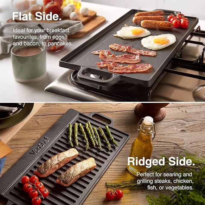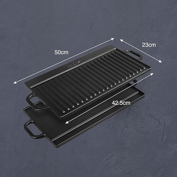 VonShef Reversible Cast Iron BBQ Griddle Pan with Handles – 50cm, Pre-Seasoned Non-Stick, Double-Sided for Hob, Oven & BBQ