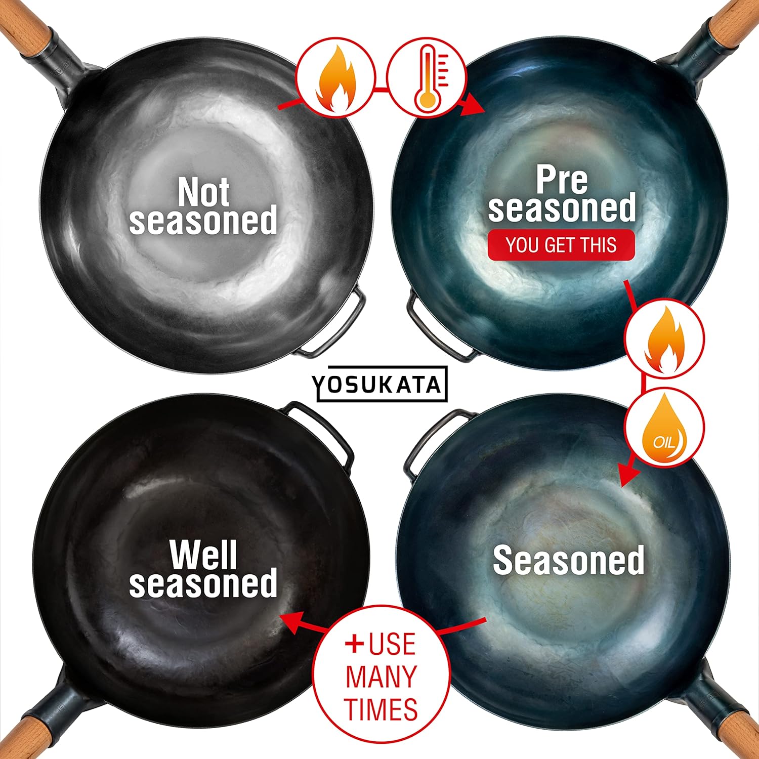 YOSUKATA 34 cm Blue Carbon Steel Wok Pan – Pre-Seasoned Flat Bottom